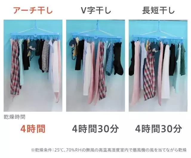 将衣服排列成不同的形状,衣服晾干的时间也不同,小编发现摆成拱形时衣服干的最快。